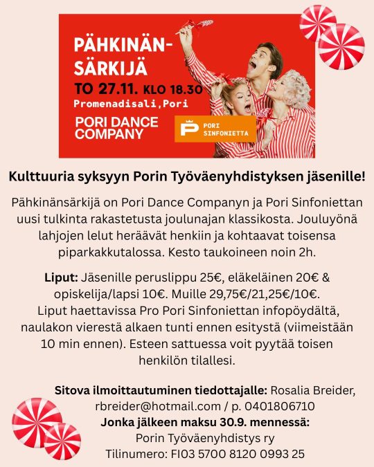 Nyt voi ilmoittautua mukaan katsomaan Pähkinänsärkijää torstaina 27.11. Porin promenadisaliin. Porin Työväenyhdistys mahdollistaa jäsenilleen normaalia edullisemmat liput tähän näytökseen.