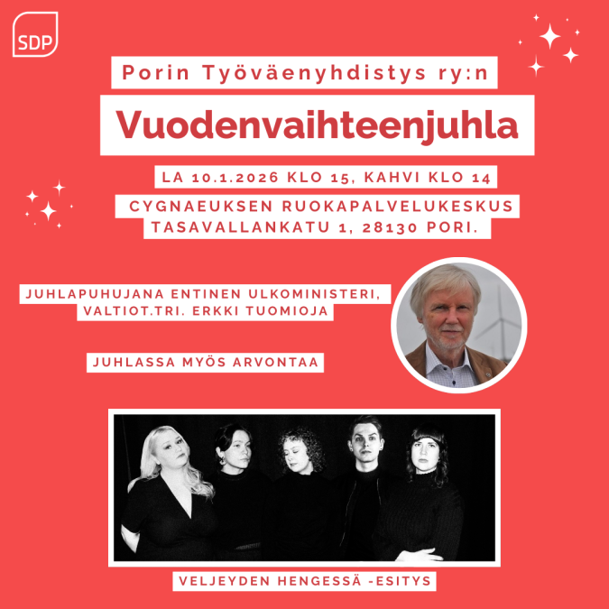 Porin Työväenyhdistys ry järjestää perinteisen vuodenvaihteen juhlan 10.1.2026 klo 15.00 Cygnaeuksen Ruokapalvelukeskuksessa, Tasavallankatu 1, 28130 Pori.